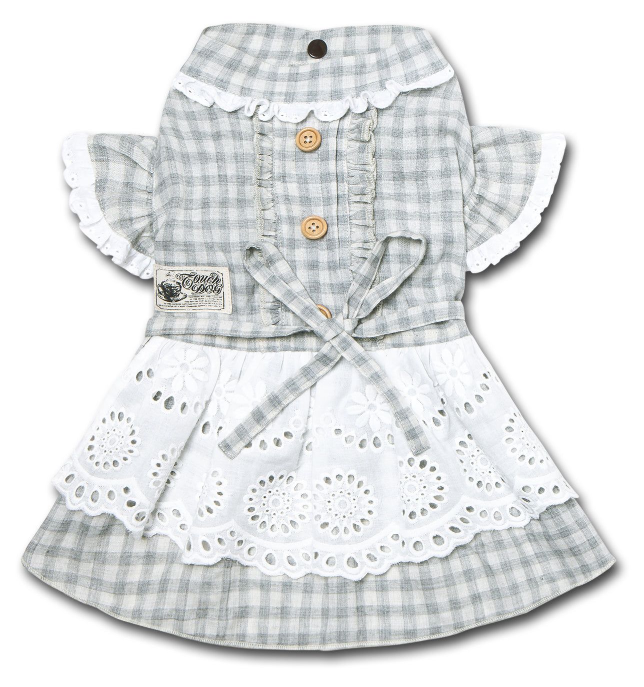 The Touchdog 'I love Poochi' Classical Fashion Designer Plaid Dog Dress is an emblematic-of-its-age vintage designer dog dress that is eloquently pieced together. This beautifully crafted dress features retro ruffles along the sleeves and collar areas with accented buttoned trims and a transparent tablecloth stitched layering by the back-side with a trendy adjustable bow for a custom fit around the chest or waist areas. Howl Grand is this masterpiece! Available in Multiple Sizes and Colors.